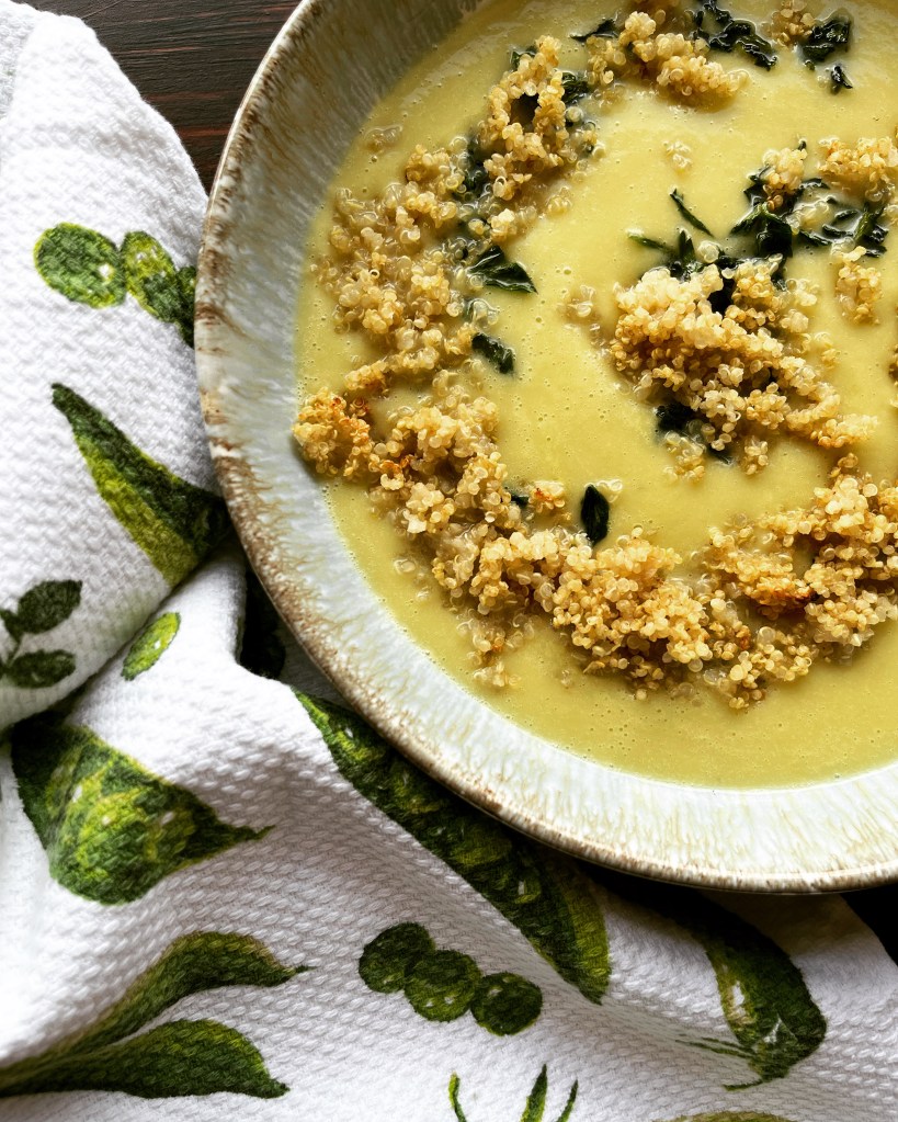 This soup is ideal for those who are on a gluten-free, and lactose-free diet and enjoy creamy vegetable soups. Use home made vegetable stock or for quick cooking use one that is your favorite. My favorite is Edward and Sons Not-Chick’n Bouillon Cubes.