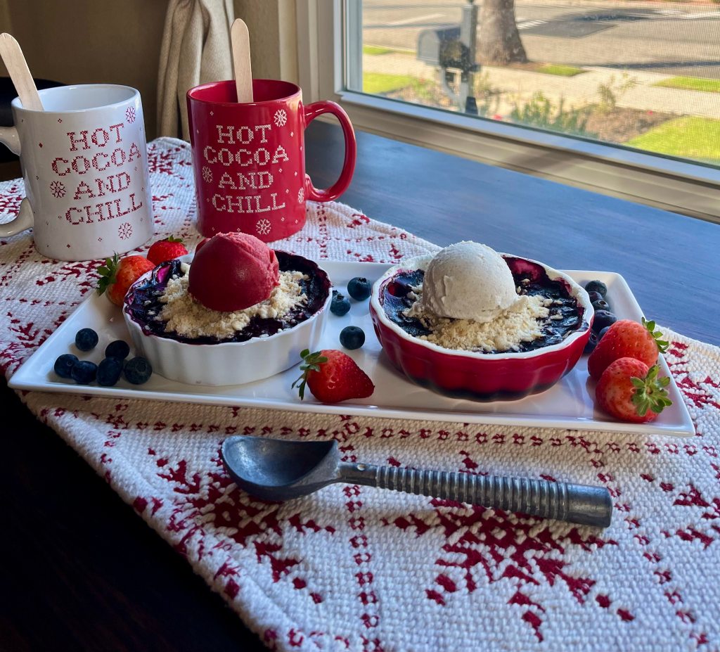 Mix 3 cups of berries with 1/4 cup of sugar and transfer the mixture to a baking dish, sprinkle topping over the berries and bake at 400F for 30-40 minutes.