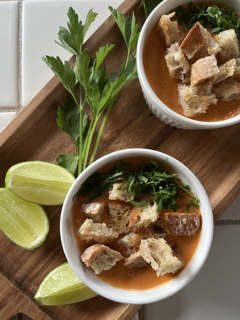 I like how simple it is to make this delicious summer classic. And I also like to give it time for the flavors to develop. If you’re planning to have this for dinner, it is the best to prepare it in the morning and let it sit for a full day before blending.
