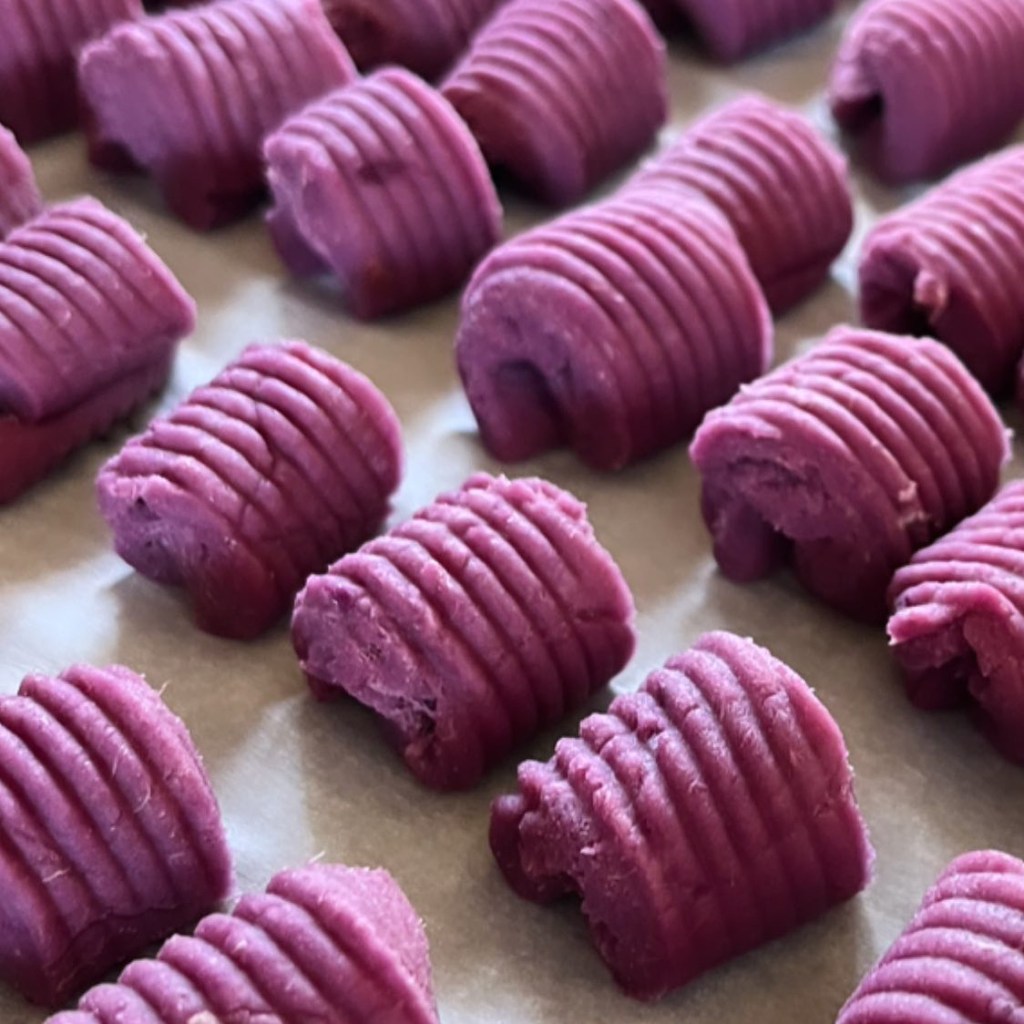 Add the flour, olive oil and salt and mix well into smooth dough. Then proceed with the gnocchi shaping. Divide the dough into 4 parts, roll each part into rope like shape. Cut into 1 cm size pieces, then roll each piece over the gnocchi board. Place on a floured baking sheet.