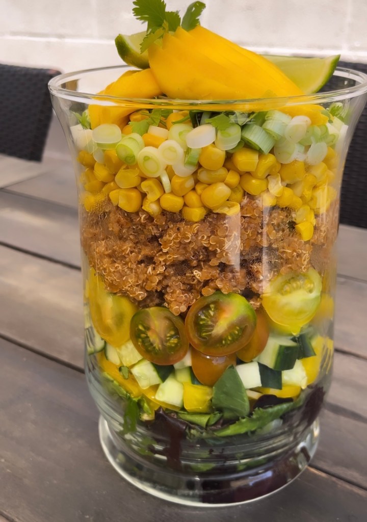 Layer the greens and all the salad ingredients in a large salad bowl or jar. If using jar, before you serve it, you put the whole content into a large salad bowl and mix it well, add more cilantro and fresh lime juice.