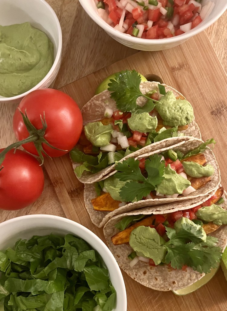To put it all together, warm up the tortillas one at a time in a cast iron pan, put some lettuce, and the sweet potato wedges inside the tortilla and top with pico de Gallo and the cilantro cream.